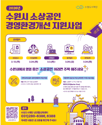 - 점포 환경 개선(간판/인테리어): 공고일 기준 수원시에서 3년 이상 계속 영업 중인 사업자 (2023년 2월 12일 이전 창업자)
